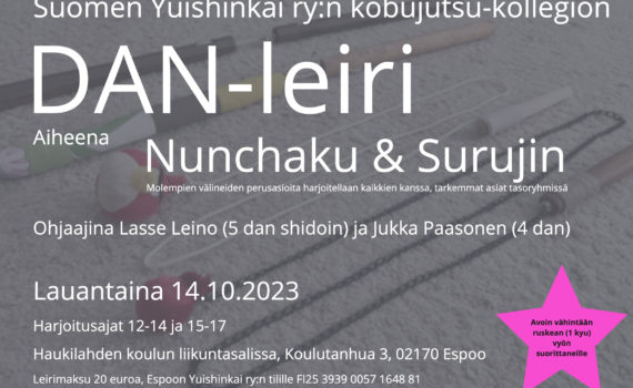 Suomen Yuishinkai ry:n kobujutsu-kollegion dan-leiri, vähintään 1 kyu:n suorittaneille Espoossa, lauantaina 14.10.2023. Ohjelmassa nunchaku- ja surujin-välineiden käyttöä kaikille osallistujille, ja myös taso-ryhmissä tarkempia muodollisia harjoituksia. Ohjaajina Lasse Leino (5 dan shidoin) ja Jukka Paasonen (4 dan). Harjoituspaikkana Haukilahden koulun liikuntasali, osoitteessa Koulutanhua 3, 02170 Espoo. Harjoitusajat 12-14 ja 15-17. Leirimaksu […]