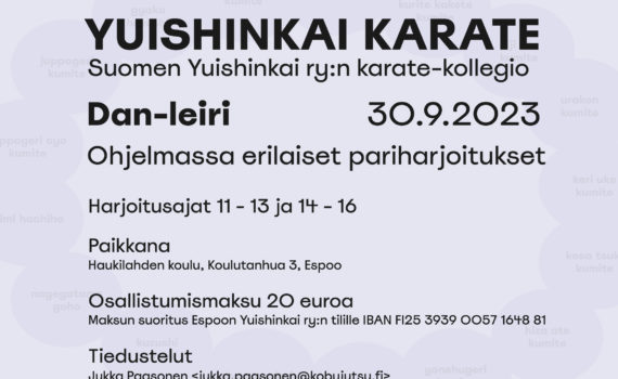 Suomen Yuishinkai ry:n karate-kollegio ohjaa dan-tason paritekniikoihin keskittyvän dan-leirin lauantaina 30.9.2023 Espoossa, Haukilahden koululla (Koulutanhua 3, Espoo). Leirille voivat osallistua kaikki vähintään 1 kyu:n (ruskean vyön) suorittaneet. Osallistumismaksu 20 euroa, joka maksetaan Espoon Yuishinkai ry:n tilille IBAN FI25 3939 0057 1648 81, BIC SBANFIHH. Harjoitukset 11 – 13 ja 14 […]