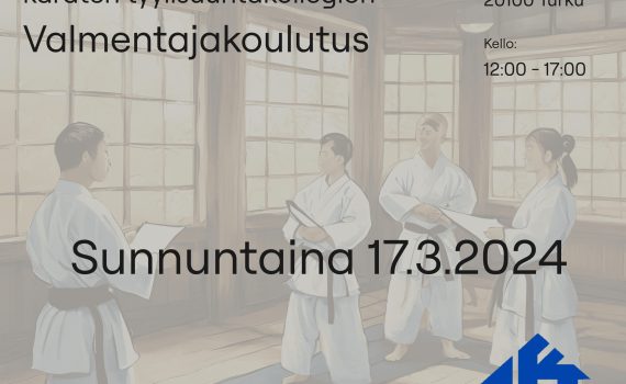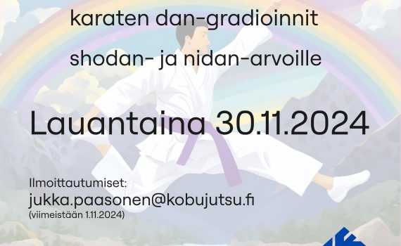 Tämän vuoden karaten tyylisuuntakollegion järjestämät dan-kokeet shodan- ja nidan-arvoille ovat Loimaalla lauantaina 30.11.2024 kello 12:00 alkaen. Paikkana Hirvihovin Liikuntakeskus, osoitteessa Kuusitie 1, 32210 Loimaa. Kokeeseen tulee ilmoittautua viimeistään 1.11.2024, Jukka Paasoselle. Tarkempia tietoja syksyn aikana ja nyt voi jo merkitä kalenteriin sen päivän jolloin vaihtaa ruskean vyön mustaksi tai korottaa […]