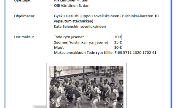 Hyvissä ajoin ennakkotietoa karaten tyylisuuntakollegion dan-leiristä, jolle voivat osallistua kaikki vähintään ruskean vyön suorittaneet Suomen Yuishinkai ry:n jäsenet. Leiripaikkana on Hirvihovin Liikuntakeskus, Kuusitie 1, 32210 Loimaa. Leirille on tulee ilmoittautua etukäteen, jotta tiedämme suunnitella osallistujamäärän ja tason mukaan sisältöä tarkemmin, viimeistään 15.9.2024. Leirimaksu 20 euroa. Lisätietoja alle liitetyssä PDF-tiedostossa.