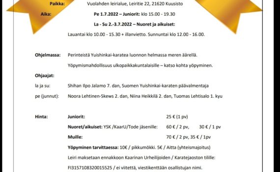 11.-12. kesäkuuta 2022 Turussa Valmentajat: Shihan Ilpo Jalamo 7. dan, Suomen Yuishinkai-karaten ja kobujutsun päävalmentaja Shihan Matts Andersson 6. dan, Ruotsin Yuishinkai-karaten ja kobujutsun päävalmentaja Ohjelmassa: Perinteistä Yuishinkai-karatea (kihon, kumite, kata) Halukkaille Ryukyu kobudoa (oma bo ja sait mukaan) Paikka: Liikuntakeskus Alfa, Raunistulantie 15, Turku Harjoitusajat: La: 12:00-14:00 (Karate), 15:00-17:00 […]