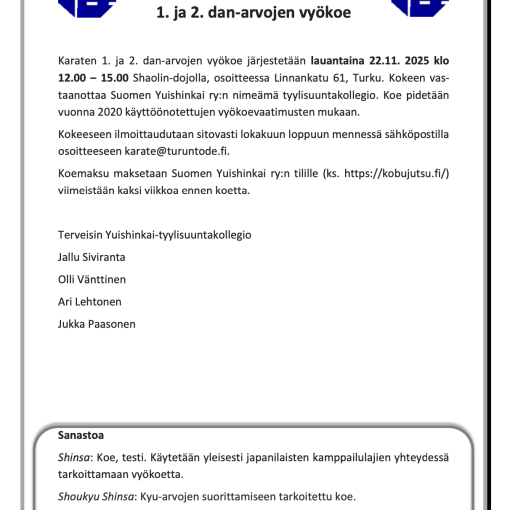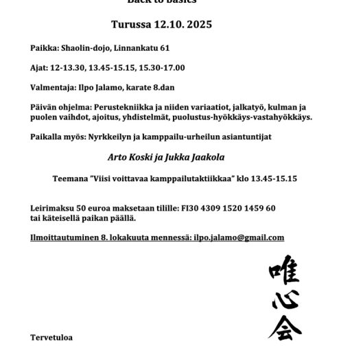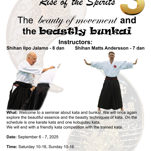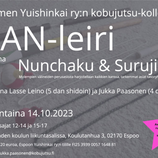 Suomen Yuishinkai ry:n kobujutsu-kollegion dan-leiri, vähintään 1 kyu:n suorittaneille Espoossa, lauantaina 14.10.2023. Ohjelmassa nunchaku- ja surujin-välineiden käyttöä kaikille osallistujille, ja myös taso-ryhmissä […]