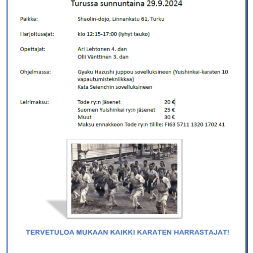 Tervetuloa Yuishinkai karaten tyylisuuntakollegion järjestämään valmentajakoulutukseen, tällä kertaa paikkana Shaolin Dojo (Linnankatu 61, 20100 Turku).