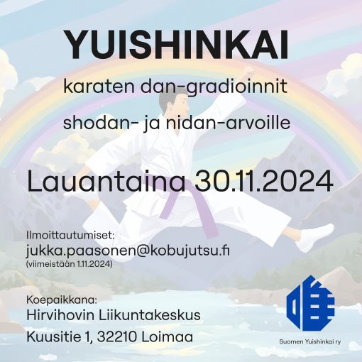 Tämän vuoden karaten tyylisuuntakollegion järjestämät dan-kokeet shodan- ja nidan-arvoille ovat Loimaalla lauantaina 30.11.2024 kello 12:00 alkaen. Paikkana Hirvihovin Liikuntakeskus, osoitteessa Kuusitie 1, […]