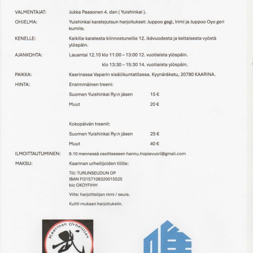 Suomen Yuishinkai ry:n karate-kollegio ohjaa dan-tason paritekniikoihin keskittyvän dan-leirin lauantaina 30.9.2023 Espoossa, Haukilahden koululla (Koulutanhua 3, Espoo). Leirille voivat osallistua kaikki vähintään […]