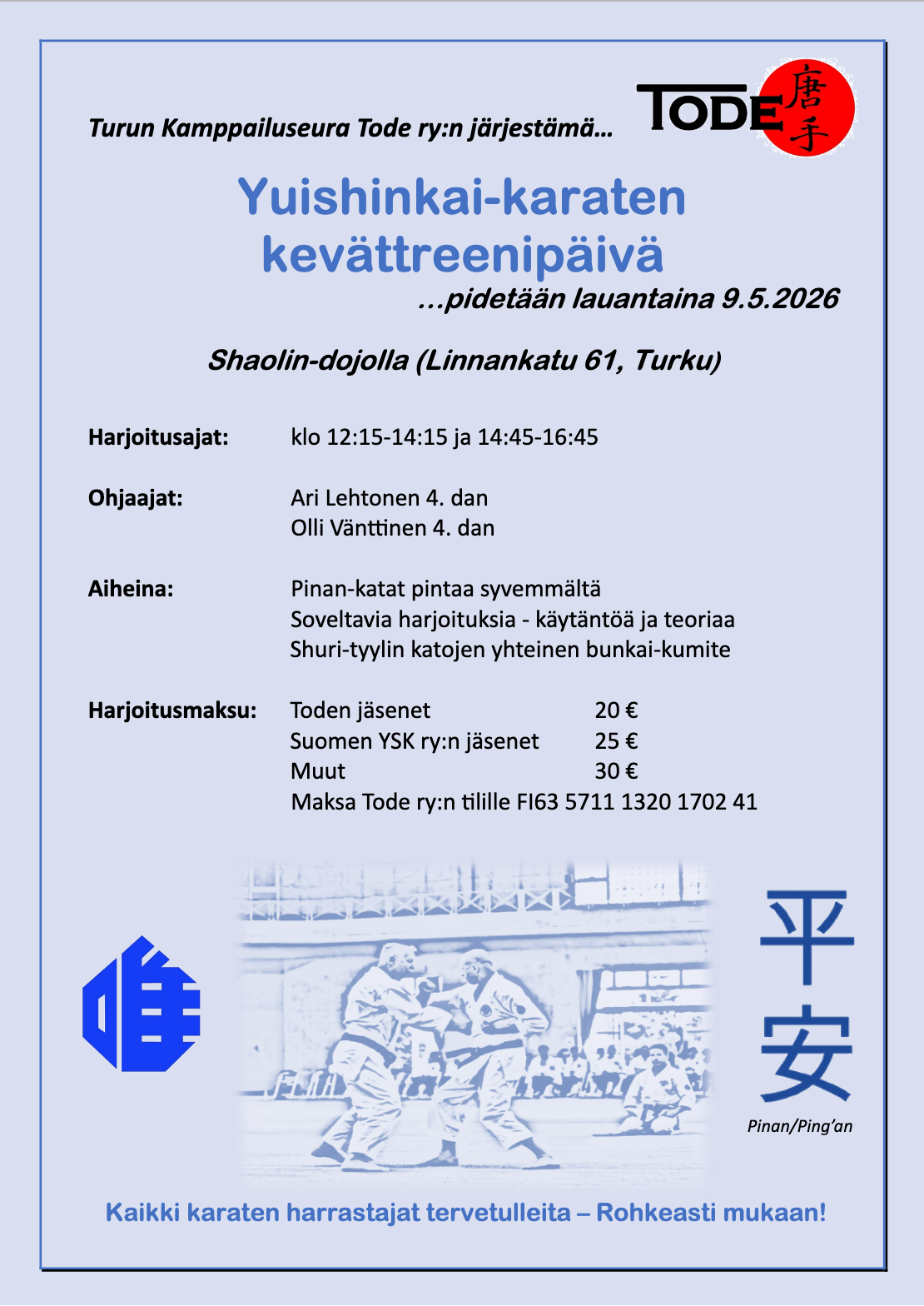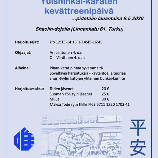 Aiheena: Sain bunkai-kumite, kata Chatanyara no sai ja kata Jigen no sai (3. dan ja ylemmät vyöt)Paikka: Shaolin, Linnankatu 61, TurkuLeiriajat: sunnuntai klo 12-14, […]